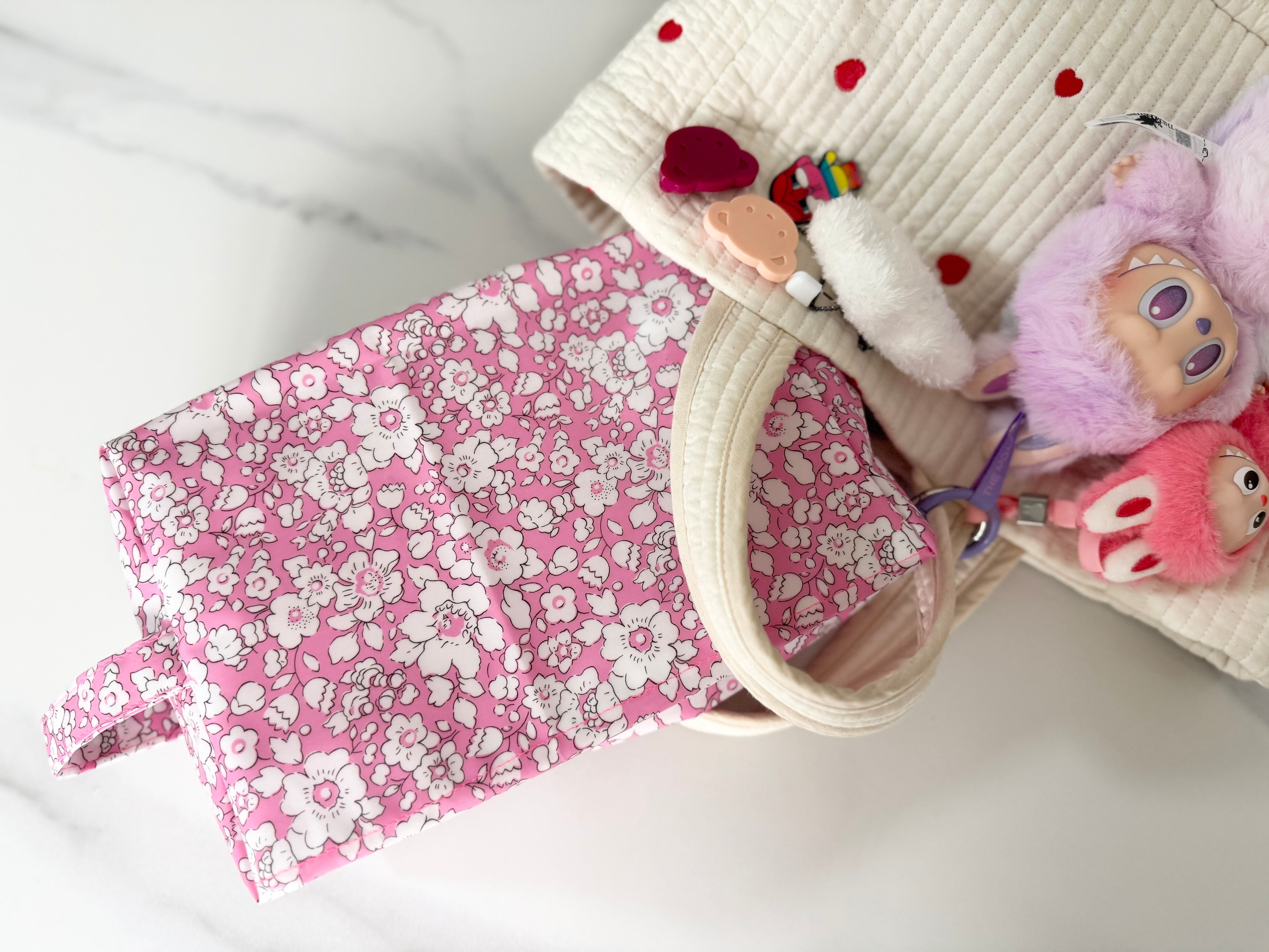 Betsyベッツィのリバティラミネート生地を使用しており、ネオンカラーの糸をアクセントで使用しております。